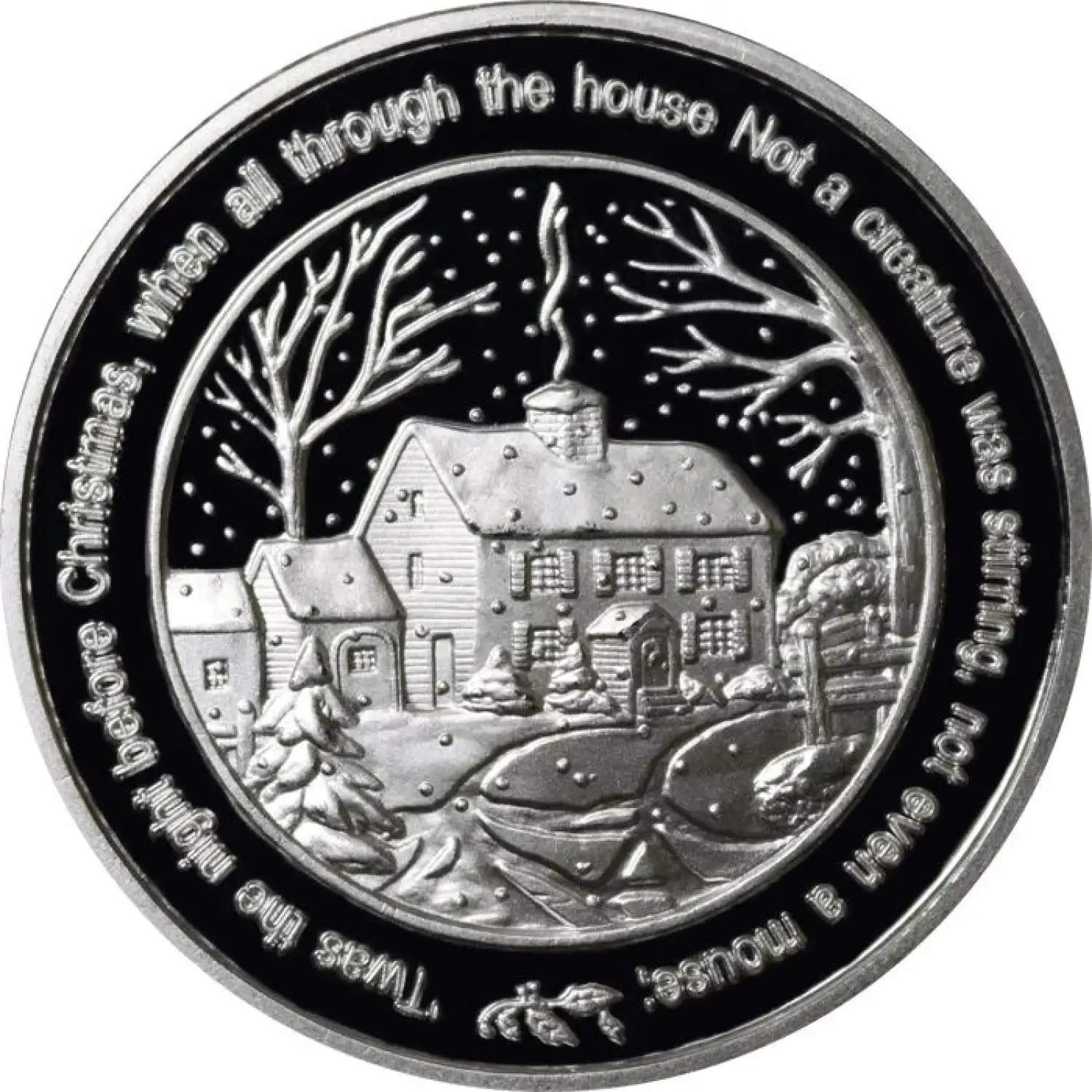 The intricate design on the round features a nostalgic scene inspired by the famous poem, "A Visit from St. Nicholas," showcasing Santa Claus and his sleigh. Each detail is delicately engraved, making it a perfect gift, a delightful collectible, or a unique ornament to cherish and pass down through generations. With its timeless imagery and pure silver composition, it embodies the joy of giving during the festive season.